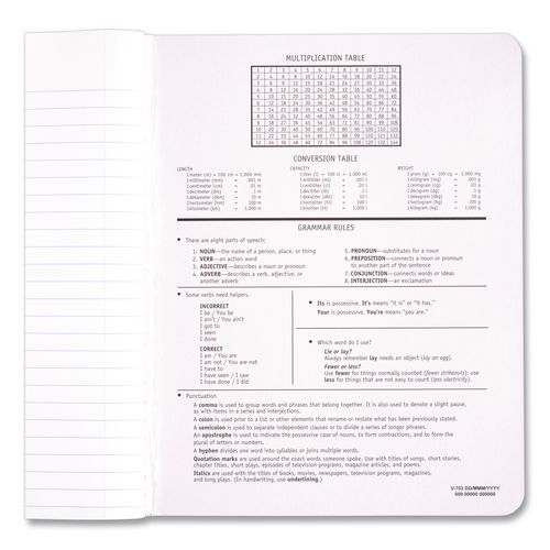Multiplication table, conversion table and grammar rules on inside back cover.