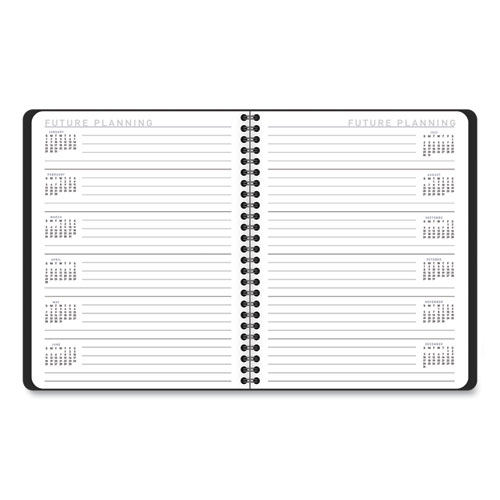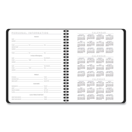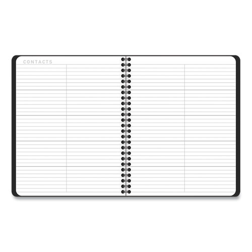 Product Details** Global Product Type Appointment Book/Personal Organizers Dated Yes Academic Year No Calendar Format Weekly/Monthly Edition Year 2026 Calendar Term 12-Month (Jan to Dec) Binding Type Wire-O Color Family Black Refillable No Calendar Spread Format One Week per Two-Page Spread,One Month per Two-Page Spread Julian Dates No Size (Bound-Side First) 8.75 x 7 Binding Details Twin-Wire Cover Color(s) Black Cover Material(s) Simulated Leather Page Theme Contemporary Lite Formatting Appointment Ruling Open Scheduling Calendar Reference Blocks Past Month,Current Month,Future Month Sheet Color(s) White Reversible No Seasonal Availability Yes Product Biodegradability Indicator N Product Biodegradability in Days 0 Product Compostability Indicator N Pre-Consumer Recycled Content Percent 0% Post-Consumer Recycled Content Percent 0% Total Recycled Content Percent 0% Country Of Origin VN Carton Weight 9 lbs. Carton Pack Quantity 12 EA Pack Quantity 0 UPC 038576407824 UNSPSC 44112005 Shipping Weight & Item Dimensions Weight 0.75 lbs. Length 8.75 in Height 7.25 in Width 0.625 in