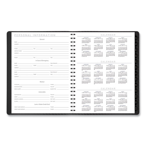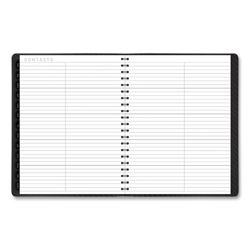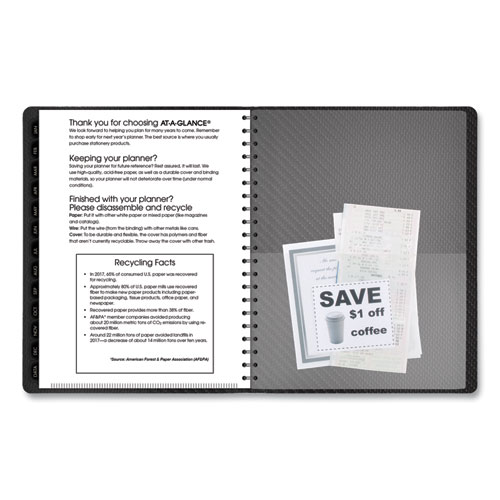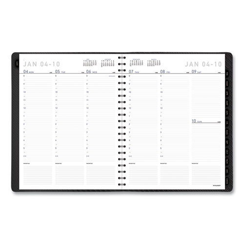 Product Details** Global Product Type Appointment Book/Personal Organizers Dated Yes Academic Year No Calendar Format Weekly/Monthly Edition Year 2026 Calendar Term 12-Month (Jan to Dec) Binding Type Wire-O Color Family Black Refillable No Calendar Spread Format One Week per Two-Page Spread,One Month per Two-Page Spread Julian Dates Yes Size (Bound-Side First) 11 x 8.25 Binding Details Twin-Wire Cover Color(s) Graphite Cover Material(s) Faux Leather Page Theme Contemporary Formatting Appointment Ruling 30-min, 8 AM to 5:30 PM (Mon-Fri),Open Scheduling (Sat-Sun) Calendar Reference Blocks Past Month,Future Month Separate Sections (40) Note Taking Pages,Future Planning Section,Telephone/Address Directory Sheet Color(s) White Pocket Details (1) Two-Sided Interior Storage Pocket Reversible No Seasonal Availability Yes Product Biodegradability Indicator N Product Biodegradability in Days 0 Product Compostability Indicator N Pre-Consumer Recycled Content Percent 0% Post-Consumer Recycled Content Percent 0% Total Recycled Content Percent 0% Special Features Weekly/Monthly-Weekly vertical-column format with evening activities and weekends. Monthly open-block format. Country Of Origin VN Carton Weight 1 lbs. Carton Pack Quantity 12 EA Pack Quantity 0 UPC 038576395350 UNSPSC 44112005 Shipping Weight & Item Dimensions Weight 0.979 lbs. Length 0.5 in Height 11.375 in Width 8.875 in