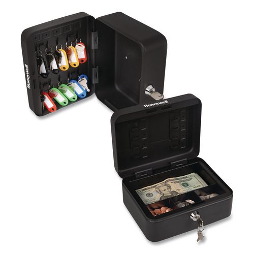 This steel security cash box can also convert to a security key box. It features a removable cash tray with three coin and one bill slots, additional storage under tray, 10 key hooks with tags and rings included, pre-drilled mounting holes and hardware. This security box will fit US dollars, Euros and most international bank notes. It can be used as either a cash box or key box and has a powder coat finish to resist scratching.