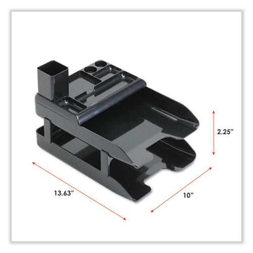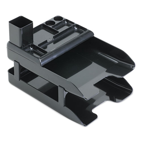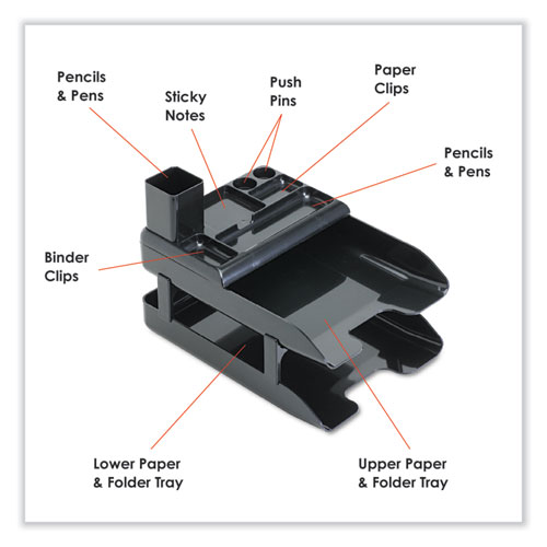 Sleek, ergonomic tray design features nonslip, anti-scratch pads that won’t damage desktop surfaces. Two letter-size trays organize and store important papers and files, while the convenient supply organizer and pencil cup sit atop the tray for easy access, or can be used alone. Sturdy tray risers allow the trays to stack for vertical organization. Finished in black metallic plastic to enhance this high-profile, modern desk set.