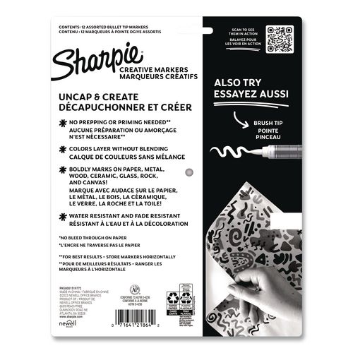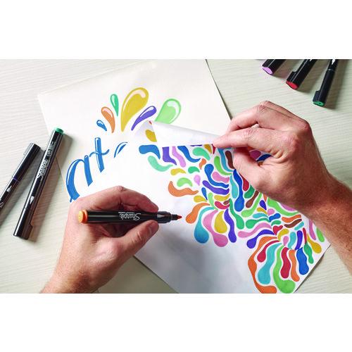 Bring your artistic vision to life with Sharpie Creative Markers! These acrylic markers feature stunning paint-like ink that glides across the page with the control of a marker. The water-based ink won’t bleed through paper, so your work stays clean. The bright color markers create vibrant marks on light and dark surfaces and boldly mark on paper, metal, wood, ceramic, glass, rock and canvas. The colors beautifully layer to add dimension to your work. What’s more, there’s no need to prime these brush tip markers-simply uncap and go!
