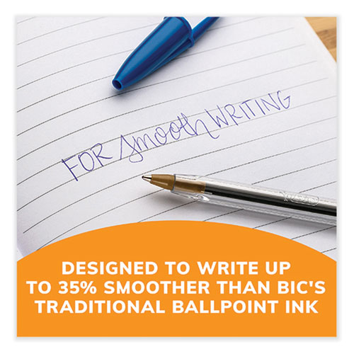 Product Details** Global Product Type Ballpoint Pens Pen Style Stick Pen Tip Type Conical Pen Point Size Type Medium Color Family Blue Erasable Ink No Refillable No Pen Sub-Brand & Product Family Cristal® Xtra Smooth Pen Type Ballpoint Pen Pen Point Size 1 mm Pen Ink Color(s) Blue Pen Barrel Color(s) Clear Pen Cap Color(s) Blue Low-Viscosity Ink No Pen Grip Type Smooth Visible Ink Supply Yes Pocket Clip Indicator Yes Product Biodegradability in Days 0 Pre-Consumer Recycled Content Percent 0% Post-Consumer Recycled Content Percent 0% Total Recycled Content Percent 0% Country Of Origin MX Carton Weight 12 lbs. Carton Pack Quantity 6 PK Pack Quantity 144 EA UPC 070330377257 UNSPSC 44121704 Shipping Weight & Item Dimensions Weight 1.872 lbs. Length 6.1 in Height 4.904 in Width 5.6 in