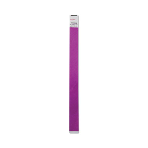 Product Details** Global Product Type Security/Crowd Management Wristbands Color(s) Purple Material(s) Tyvek® Band/Adhesive Closure Wristbands Depicted Text Sequentially Numbered Wristband Type Security/Crowd Management Length 9.75″ Width 0.75″ Product Biodegradability Indicator N Product Biodegradability in Days 0 Product Compostability Indicator N Pre-Consumer Recycled Content Percent 0% Post-Consumer Recycled Content Percent 0% Total Recycled Content Percent 0% Country Of Origin US Carton Weight 2 lbs. Carton Pack Quantity 20 PK Pack Quantity 100 EA UPC 091141754402 UNSPSC 55121804 Shipping Weight & Item Dimensions Weight 0.1 lbs. Length 10 in Height 0.375 in Width 3.25 in Warranty Manufacturer’s 90-day warranty.