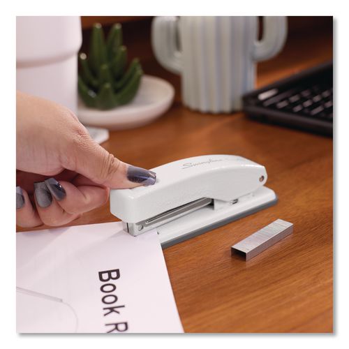 Product Details** Global Product Type Compact Desktop Staplers High Capacity Stapling No Flat Clinch Plate No Power Source(s) Manual Tacking Yes Color Family White Staple Loading Top Staple Capacity Half Strip (105 Staples) Type of Staple Used S.F.® 3 Sheet Capacity 20 Replacement Staples Swingline® S7035440 (35440) Leg Size 0.25″ Crown Size 0.5″ Fastener Gauge 23 AWG Color(s) Arctic White Material(s) Metal Throat Depth 2.5″ Product Biodegradability Indicator N Product Biodegradability in Days 0 Product Compostability Indicator N Pre-Consumer Recycled Content Percent 0% Post-Consumer Recycled Content Percent 0% Total Recycled Content Percent 0% Country Of Origin VN Carton Weight 3 lbs. Carton Pack Quantity 6 EA Pack Quantity 0 UPC 074711035071 UNSPSC 44121615 Shipping Weight & Item Dimensions Weight 0.577 lbs. Length 1.614 in Height 5.25 in Width 7 in Warranty Manufacturer’s limited lifetime warranty.