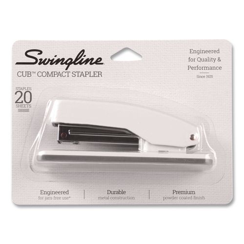 Say hello to the modern-day workspace hero. The Swingline® Cub Compact Stapler is small but mighty, and easily takes on your everyday stapling jobs. Perfect for home offices, cubicles and anywhere you work. Compact design for both desktop and handheld usage. Jam Free guaranteed when used with Swingline® S.F.® 3 Premium Staples. Staple up to 20 sheets when used with Swingline® staples. Durable, premium metal construction with textured powder coat finish. Stapler holds a half strip of 105 staples. Stapler opens for tacking and has a low staple indicator.
