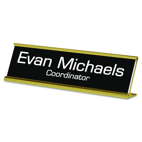 Metal holder and acrylic name plate. Your choice of nine engraving colors and five fonts. Text only. Accommodates up to three lines ot text.
