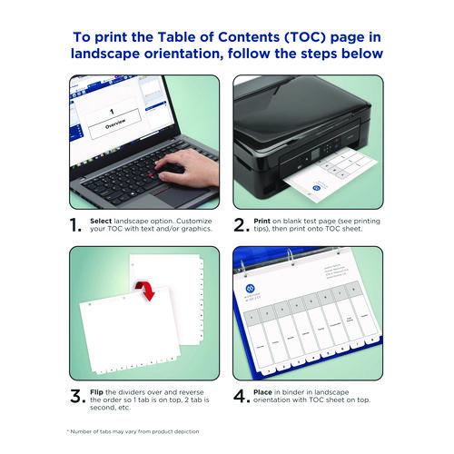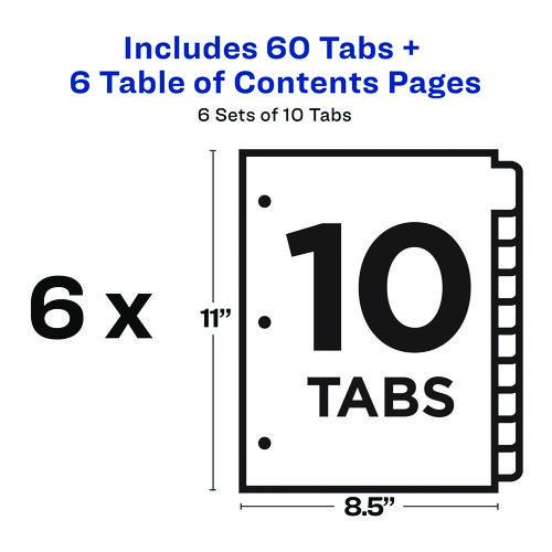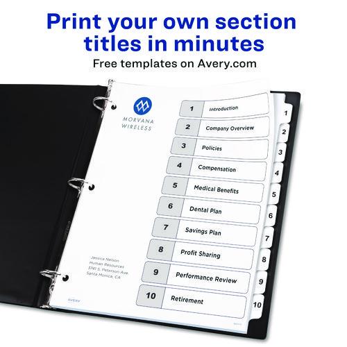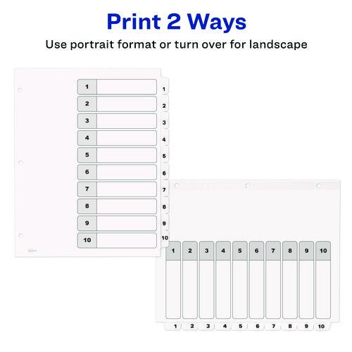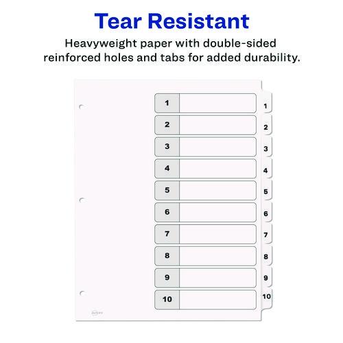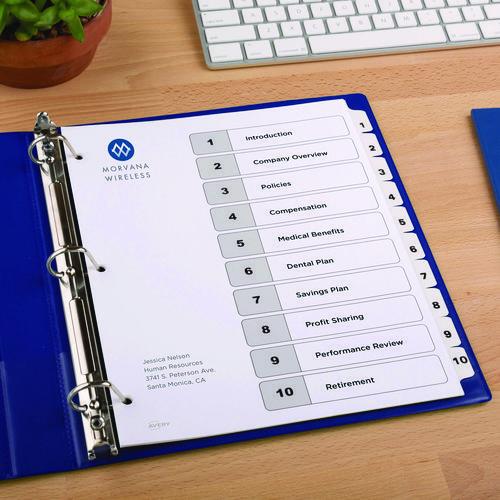 Product Details** Global Product Type Printed Numeric Index Dividers Index Divider Style Arabic Numeric Tab Orientation Side Tab Tab Style 10-Tab Color Family White Punched/Unpunched 3-Hole Punched Index Divider Size 11 x 8.5 For Use With Ring Binders Index Divider Material(s) Paper Index Divider Color(s) White Tab Color(s) White Tab Title(s) 1 to 10 Tab Title Color(s) Black Binding Edge Feature(s) Double-Sided Clear Plastic Edge Reinforcing Machine Compatibility Inkjet Printers,Laser Printers Index Divider Form Quantity 6 Sets Product Biodegradability in Days 0 Pre-Consumer Recycled Content Percent 0% Post-Consumer Recycled Content Percent 0% Total Recycled Content Percent 0% Country Of Origin MX Carton Weight 10 lbs. Carton Pack Quantity 8 PK Pack Quantity 6 EA UPC 072782118235 UNSPSC 44122010 Shipping Weight & Item Dimensions Weight 1.1 lbs. Length 11.106 in Height 0.794 in Width 8.918 in
