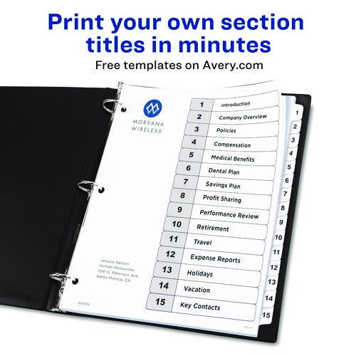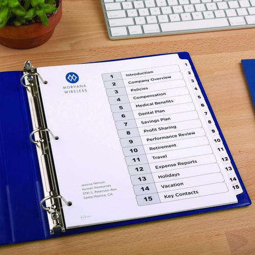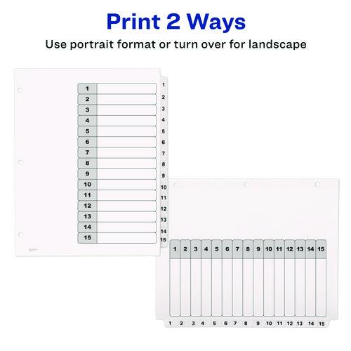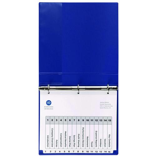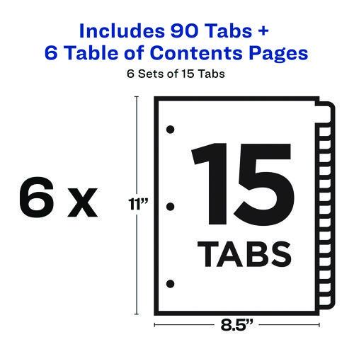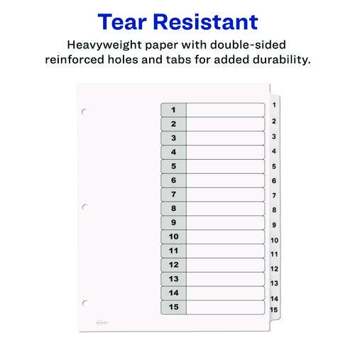 Product Details** Global Product Type Printed Numeric Index Dividers Index Divider Style Arabic Numeric Tab Orientation Side Tab Tab Style 15-Tab Color Family White Punched/Unpunched 3-Hole Punched Index Divider Size 11 x 8.5 For Use With Ring Binders Index Divider Material(s) Paper Index Divider Color(s) White Tab Color(s) White Tab Title(s) 1 to 15 Tab Title Color(s) Black Binding Edge Feature(s) Double-Sided Clear Plastic Edge Reinforcing Machine Compatibility Inkjet Printers,Laser Printers Index Divider Form Quantity 6 Sets Product Biodegradability in Days 0 Pre-Consumer Recycled Content Percent 0% Post-Consumer Recycled Content Percent 0% Total Recycled Content Percent 0% Country Of Origin MX Carton Weight 10 lbs. Carton Pack Quantity 6 PK Pack Quantity 6 EA UPC 072782118259 UNSPSC 44122010 Shipping Weight & Item Dimensions Weight 1.595 lbs. Length 11.013 in Height 1 in Width 8.827 in