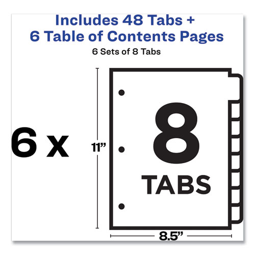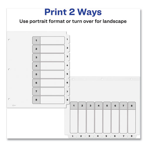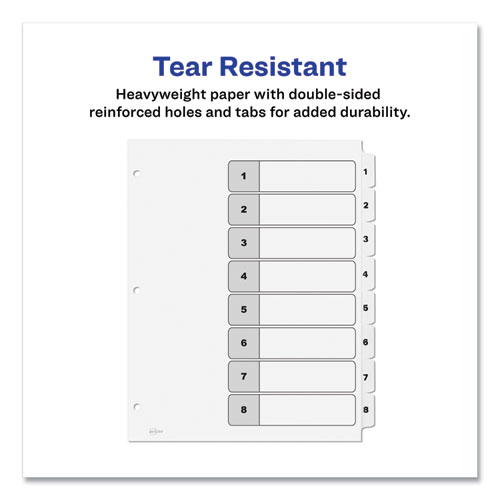 Product Details** Global Product Type Printed Numeric Index Dividers Index Divider Style Arabic Numeric Tab Orientation Side Tab Tab Style 8-Tab Color Family White Punched/Unpunched 3-Hole Punched Index Divider Size 11 x 8.5 For Use With Ring Binders Index Divider Material(s) Paper Index Divider Color(s) White Tab Color(s) White Tab Title(s) 1 to 8 Tab Title Color(s) Black Binding Edge Feature(s) Double-Sided Clear Plastic Edge Reinforcing Machine Compatibility Inkjet Printers,Laser Printers Index Divider Form Quantity 6 Sets Product Biodegradability in Days 0 Pre-Consumer Recycled Content Percent 0% Post-Consumer Recycled Content Percent 0% Total Recycled Content Percent 0% Country Of Origin MX Carton Weight 10 lbs. Carton Pack Quantity 10 PK Pack Quantity 6 EA UPC 072782118228 UNSPSC 44122010 Shipping Weight & Item Dimensions Weight 0.91 lbs. Length 10.905 in Height 0.691 in Width 9 in