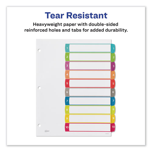 Product Details** Global Product Type Printed Numeric Index Dividers Index Divider Style Arabic Numeric Tab Orientation Side Tab Tab Style 10-Tab Color Family White Punched/Unpunched 3-Hole Punched Index Divider Size 11 x 8.5 For Use With Ring Binders Index Divider Material(s) Paper Index Divider Color(s) White Tab Material(s) Paper Tab Color(s) Assorted Tab Title(s) 1 to 10 Tab Title Color(s) White Binding Edge Feature(s) Double-Sided Clear Plastic Edge Reinforcing Index Divider Form Quantity 1 Set Product Biodegradability in Days 0 Pre-Consumer Recycled Content Percent 0% Post-Consumer Recycled Content Percent 0% Total Recycled Content Percent 0% Special Features Contemporary Colors Country Of Origin MX Carton Weight 9 lbs. Carton Pack Quantity 36 ST Pack Quantity 10 EA UPC 072782118426 UNSPSC 44122010 Shipping Weight & Item Dimensions Weight 0.231 lbs. Length 11 in Height 0.125 in Width 9 in