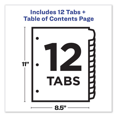 Product Details** Global Product Type Printed Numeric Index Dividers Index Divider Style Arabic Numeric Tab Orientation Side Tab Tab Style 12-Tab Color Family White Punched/Unpunched 3-Hole Punched Index Divider Size 11 x 8.5 For Use With Ring Binders Index Divider Material(s) Paper Index Divider Color(s) White Tab Material(s) Paper Tab Color(s) Assorted Tab Title(s) 1 to 12 Tab Title Color(s) White Binding Edge Feature(s) Double-Sided Clear Plastic Edge Reinforcing Index Divider Form Quantity 1 Set Product Biodegradability in Days 0 Pre-Consumer Recycled Content Percent 0% Post-Consumer Recycled Content Percent 0% Total Recycled Content Percent 0% Special Features Contemporary Colors Country Of Origin MX Carton Weight 9 lbs. Carton Pack Quantity 24 ST Pack Quantity 12 EA UPC 072782118433 UNSPSC 44122010 Shipping Weight & Item Dimensions Weight 0.231 lbs. Length 11 in Height 0.125 in Width 9 in