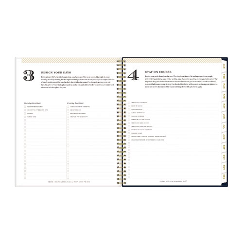 • Weekly view per two-page spread contains space for daily schedule, to-do list, notes and gratitude sections, and an inspirational quote.