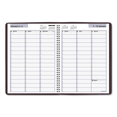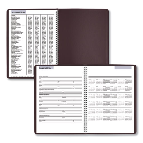Product Details** Global Product Type Appointment Book/Personal Organizers Dated Yes Academic Year No Calendar Format Weekly Edition Year 2026 Calendar Term 12-Month (Jan to Dec) Binding Type Wire-O Color Family Red Refillable No Calendar Spread Format One Week per Two-Page Spread Julian Dates Yes Size (Bound-Side First) 11 x 8 Binding Details Twin-Wire Cover Color(s) Burgundy Cover Material(s) Simulated Leather Appointment Ruling 15-min, 7 AM to 9:45 PM (Mon-Fri),15-min, 7 AM to 6:45 PM (Sat),Open Scheduling (Sun) Calendar Reference Blocks Past Month,Current Month,Two Future Months Sheet Color(s) White Reversible No Seasonal Availability Yes Product Biodegradability Indicator N Product Biodegradability in Days 0 Product Compostability Indicator N Pre-Consumer Recycled Content Percent 0% Post-Consumer Recycled Content Percent 0% Total Recycled Content Percent 0% Special Features Vertical-Column Format-Past, current and two future months reference. Country Of Origin VN Carton Weight 35 lbs. Carton Pack Quantity 48 EA Pack Quantity 0 UPC 038576398856 UNSPSC 44112005 Shipping Weight & Item Dimensions Weight 0.686 lbs. Length 11.2 in Height 0.6 in Width 8.5 in