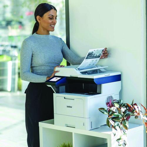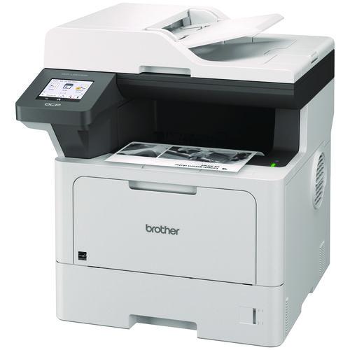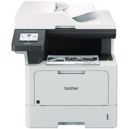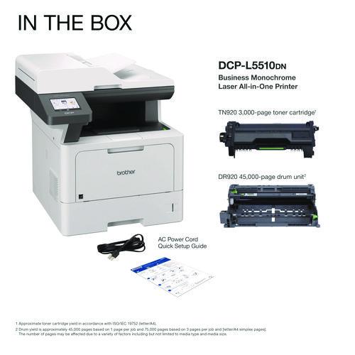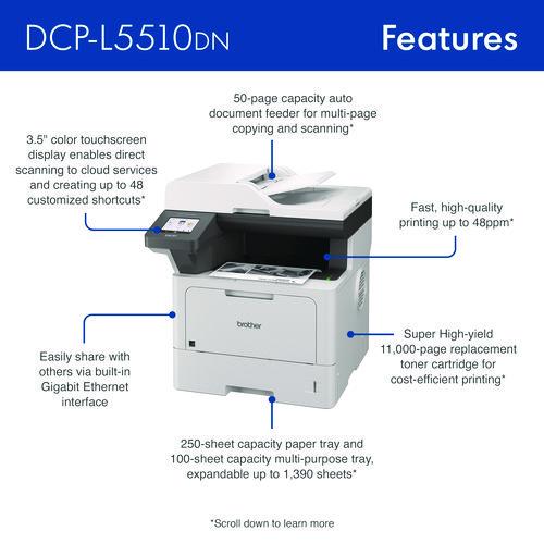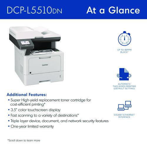 The Brother DCP-L5510DN business monochrome laser all-in-one printer is a great choice for busy offices and small workgroups that need cost-efficient printing, versatile paper handling, advanced security features, and reliable output. Helps to increase productivity with fast printing and copying up to 48 ppm. Delivers cost-efficient printing by using the Brother Genuine TN920XXL super high-yield replacement toner cartridge. Multi-page scanning. Scan to popular destinations directly from the touchscreen display. Triple Layer Security features help to limit document and device access and protect against network intrusions. Expandable paper capacity. Gigabit Ethernet interface. Easily print from and scan to mobile devices.