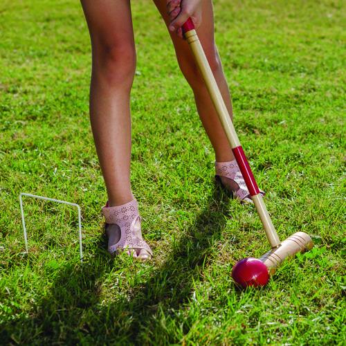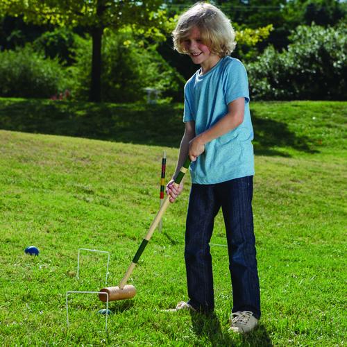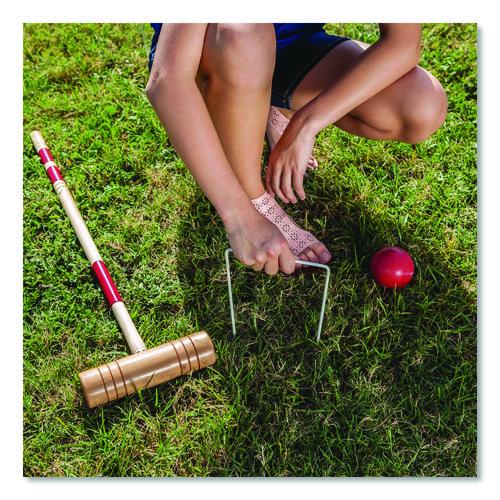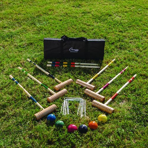 Hold your own croquet competition at the park, club or out on the schoolyard with this convenient Champion Sports Deluxe Tournament Croquet Set. The set features durable, brightly colored balls that will be easy to spot on any lawn and heavy-duty steel wickets will stand up to game after game. The hardwood mallets have a comfortable shape and feature a new and improved handle connector to keep them in peak condition. Designed for players of all skill levels, this croquet set includes a complete set of rules and a durable nylon carry bag.