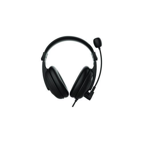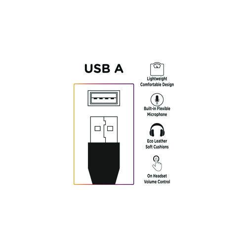 Multimedia stereo USB headset. Built-in adjustable boom microphone. Headset volume controls. Lightweight comfortable design with eco-leather ear cushions.
