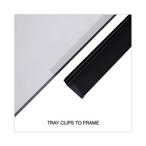 Modern dry erase board with sleek black, heavy-duty frame. Smooth writing surface that’s ideal for personal work areas to help keep schedules and tasks organized. Versatile board with four, rounded corners enables vertical and horizontal mounting with included hardware. Board wipes clean every time wipes clean with cloth, eraser, or dry erase wipes. Dry erase makers and erasers sold separately.