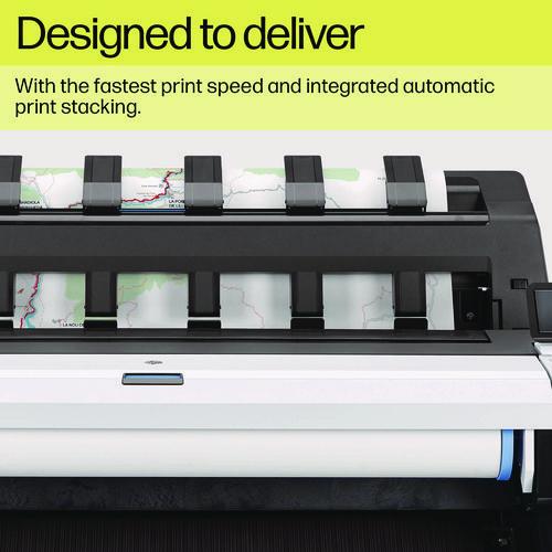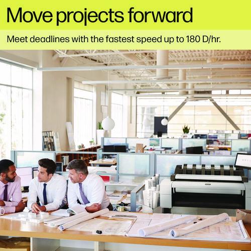 Cut out unproductive tasks with integrated automatic print stacking, up to 100 pages. Control who accesses the printer and its confidential documents with secure user authentication. Meet deadlines with the fastest speed and dual roll option. Showcase design versatility from precise line drafts to boldly colored 3D renders, with HP Bright Office Inks.
