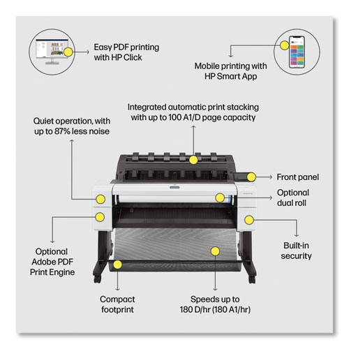 Adopt a smart workstyle with easy PDF printing using HP Click software. Empower your workforce. Easily print and share jobs from the cloud with your mobile device and HP Smart app. Fits your workplace with the most compact footprint and most quiet operation, with up to 87% less noise. Best of class network protection with features like HP Secure Boot and whitelisting. Control who accesses the printer and its confidential documents with secure user authentication. Keep your fleet secure with HP JetAdvantage Security Manager. Showcase design versatility from precise line drafts to boldly colored 3D renders, with HP Bright Office Inks.