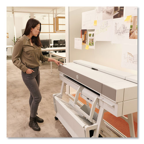 Boost productivity with the world’s most efficient half size to D size experience. Do it all—print multi-size CAD and renders with the integrated input/output tray. Save time with HP Click. And go beyond with this robust and compact plotter. Invest in a robust and compact plotter that’s designed to last. Protect your printer and data from cyberthreats without any effort thanks to HP Wolf Pro Security. Save time with HP Click—print in fewer steps and avoid reprinting with print preview. Pick up your jobs quickly and simply—stacker holds up to 40 pages flat for easy collection. Seamlessly print your half-size jobs with integrated input and output trays, keeping pages sorted by size. Move projects forward with fast print speeds, 300 ft roll, and high image quality with HP Flex Tech Inks.