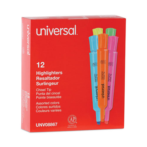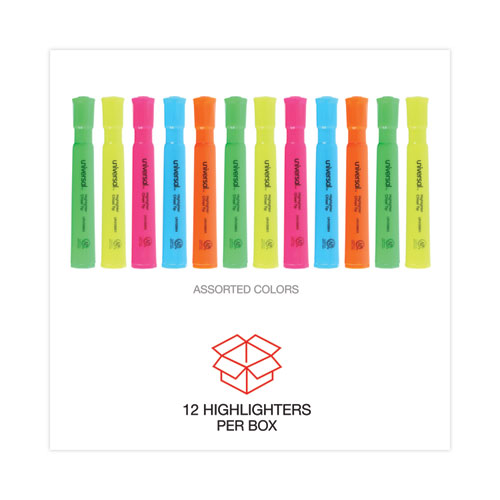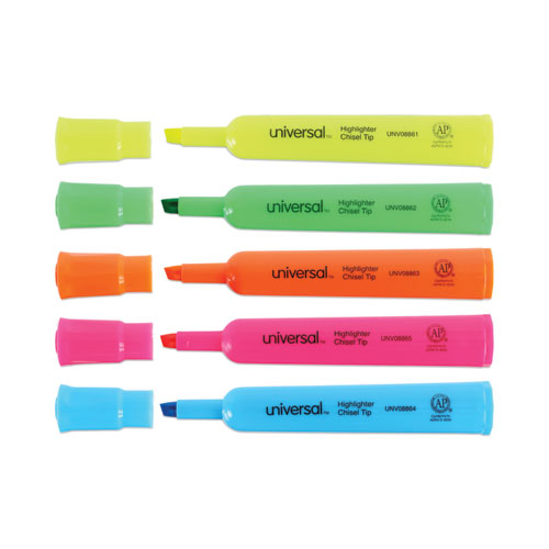 Universal™ Desk Highlighters are well-designed highlighting pens that feature bright, vibrant colors. The chisel tip allows for both broad and narrow lines. Large cap holds firmly on either end of the highlighter so it doesn’t get lost. The bright ink stands out on the page, dries quickly, and will not fade. Enjoy effortless highlighting with a smooth barrel that’s easy to hold.
