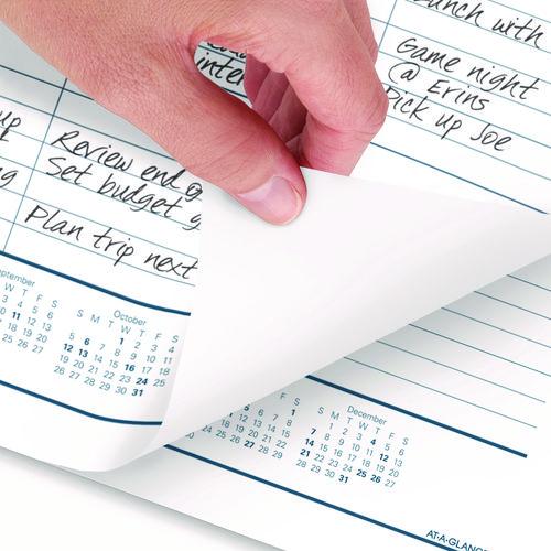 Desk pad is printed in blue and gray ink for a classic but stylish look. One month per page with unruled daily blocks and full-year calendar reference. Durable backboard provides a sturdy writing surface. Black, wide paper headband. Printed on high-quality paper with superior ink bleed resistance.