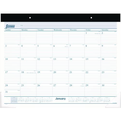 Product Details** Global Product Type Desk Pad Calendars Dated Yes Academic Year No Calendar Format Monthly Edition Year 2026 Calendar Term 12-Month (Jan to Dec) Binding Type Stapled,Taped Color Family White Refillable No Calendar Spread Format One Month per Page Julian Dates Yes Size (Bound-Side First) 21.75 x 17 Binding Color(s) Black Corner Color(s) Clear Calendar Reference Blocks Current Year Sheet Color(s) White Punching Top: 2-Hole Holder Style Two-Corner Desk-Pad (Included) Holder Color Clear Holder Material Synthetic-Fiber-Backed Tape,Plastic Hanger Style Eyelet Reversible No Seasonal Availability Yes Product Biodegradability Indicator N Product Biodegradability in Days 0 Product Compostability Indicator N Pre-Consumer Recycled Content Percent 0% Post-Consumer Recycled Content Percent 0% Total Recycled Content Percent 0% Country Of Origin CN Carton Weight 14 lbs. Carton Pack Quantity 12 EA Pack Quantity 0 UPC 038576402027 UNSPSC 44121621 Shipping Weight & Item Dimensions Weight 1.125 lbs. Length 8.5 in Height 0.188 in Width 22 in