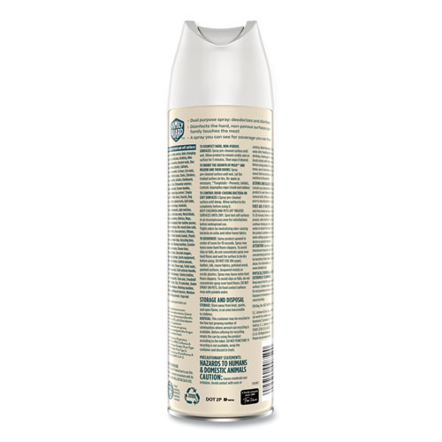 Product Details** Global Product Type Disinfectants/Sanitizers Physical Form Liquid Scent Citrus Volume Capacity 17.5 oz Product Packaging Aerosol Spray Application Disinfectant/Cleaner Applicable Material Hard Non-Porous Surfaces,Soft Surfaces Chemical Compound Triethylene Glycol, B-Alkyl,Dimethyl Benzly Ammonium Saccharinate Dirt Types Germs,Viruses Product Biodegradability Indicator N Product Biodegradability in Days 0 Product Compostability Indicator N Pre-Consumer Recycled Content Percent 0% Post-Consumer Recycled Content Percent 0% Total Recycled Content Percent 0% Country Of Origin US Carton Weight 12 lbs. Carton Pack Quantity 8 EA Pack Quantity 0 UPC 025700008590 UNSPSC 47131800 Shipping Weight & Item Dimensions Weight 11.62 lbs. Length 10.625 in Height 10.813 in Width 5.563 in