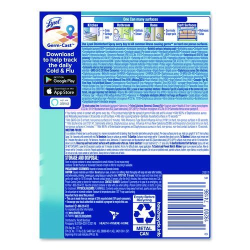 Product Details** Global Product Type Disinfectants/Sanitizers Physical Form Liquid Scent Crisp Linen Volume Capacity 12.5 oz Product Packaging Aerosol Spray Application Disinfectant/Sanitizer Applicable Material Hard, Non-Porous Surfaces Chemical Compound Ethanol, Alkyl (50% C14, 40% C12, 10% C16) Dimethyl Benzyl Ammonium Saccharinate Dirt Types Bacteria,Fungus,Germs,Mildew,Mold,Viruses Product Biodegradability Indicator N Product Biodegradability in Days 0 Product Compostability Indicator N Compliance Standards EPA Reg. No. 777-99,EPA List N,Complies with the VOC (Volatile Organic Compound) limits, including California,Fully registered with the Federal EPA and each of the 50 State EPA agencies (and the District of Columbia),Compliant with TSCA regulations,Meets AOAC Germicidal Spray Product Test standards for hospital aerosol disinfectants,Meets OSHA’s Bloodborne Pathogens Standard Pre-Consumer Recycled Content Percent 0% Post-Consumer Recycled Content Percent 0% Total Recycled Content Percent 0% Country Of Origin US Carton Weight 13 lbs. Carton Pack Quantity 12 EA Pack Quantity 0 UPC 019200741866 UNSPSC 47131803 Shipping Weight & Item Dimensions Weight 1 lbs. Length 7.94 in Height 2.63 in Width 2.63 in