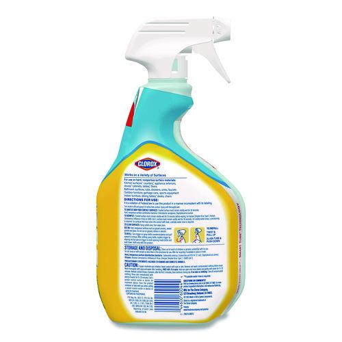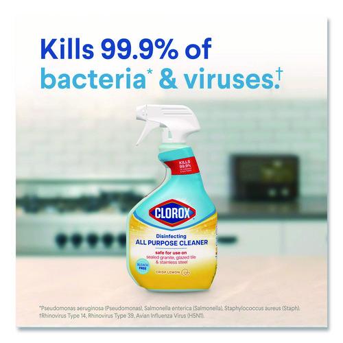 Tackle everyday messes with Clorox® Disinfecting All Purpose Cleaner that cuts through tough grease and grime on a variety of surfaces. Safe to use on multiple hard, nonporous surfaces like kitchen sinks, counters, refrigerators, appliances, tubs, toilets, fiberglass, floors, showers and tile, this disinfecting spray leaves behind a crisp lemon scent without the odor of bleach for a sparkling clean experience in your home. It even kills 99.9% of bacteria and viruses and stops bacteria growth for 24 hours on hard, nonporous nonfood contact surfaces when used as directed. Just see what Clorox® Disinfecting All Purpose Cleaner can handle: dirt, fingerprints, food, oily spills, greasy spatters, messes, food stains, grime, outdoor grime, smudges, soap scum, sticky food and tough soils. Enjoy confidence in a long lasting clean with Clorox® Disinfecting All Purpose Cleaner.