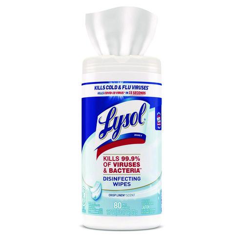 Product Details** Global Product Type Cleaner/Detergent Wet Wipes Towel/Wipe Type Cleaning/Disinfecting Wipes Material(s) Nonwoven Fiber Number of Plies 1 Number of Towels/Wipes Per Container 80 Scent Crisp Linen® Color(s) White Applicable Material Linoleum,Metal,Plastic,Porcelain,Stainless Steel,Tile Chemical Compound Alkyl (50%C14, 40%C12, 10%C16) Dimethyl Benzyl Ammonium Chlorides Dirt Types Bacteria,Dirt,Dust,Everyday Messes,Food Spills,Viruses Length 7.25″ Width 7″ Product Packaging Canister Application Appliances,Cabinets,Counters,Door Knobs,Floors,Garbage Cans,Light Switches,Remote Controls,Smartphones,Tablets,Telephones,Toilets Product Biodegradability Indicator N Product Biodegradability in Days 0 Product Compostability Indicator N Compliance Standards EPA Reg. No. 777-114,EPA List N,Complies with the VOC (Volatile Organic Compound) limits, including California,Fully registered with the Federal EPA and each of the 50 State EPA agencies (and the District of Columbia). Each product bears an EPA Registration Number on the product label,Complies with TSCA regulations,USDA Certified Biobased Product 55% Pre-Consumer Recycled Content Percent 0% Post-Consumer Recycled Content Percent 0% Total Recycled Content Percent 0% Special Features Value Pack-Stock up and save! Country Of Origin US Carton Weight 11 lbs. Carton Pack Quantity 6 EA Pack Quantity 0 UPC 019200893466 UNSPSC 47131803 Shipping Weight & Item Dimensions Weight 10.5 lbs. Length 13.2 in Height 8.5 in Width 8.82 in