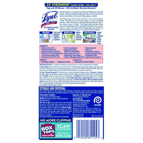 Product Details** Global Product Type Cleaner/Detergent Wet Wipes Towel/Wipe Type Cleaning/Disinfecting Wipes Material(s) Nonwoven Fiber Number of Plies 1 Number of Towels/Wipes Per Container 35 Scent Lemon & Lime Blossom® Color(s) White Applicable Material Linoleum,Metal,Plastic,Porcelain,Stainless Steel,Tile Chemical Compound Alkyl (50%C14, 40%C12, 10%C16) Dimethyl Benzyl Ammonium Chlorides Dirt Types Bacteria,Dirt,Dust,Everyday Messes,Food Spills,Viruses Length 7.25″ Width 7″ Product Packaging Canister Application Appliances,Cabinets,Counters,Door Knobs,Floors,Garbage Cans,Light Switches,Remote Controls,Smartphones,Tablets,Telephones,Toilets Product Biodegradability Indicator N Product Biodegradability in Days 0 Product Compostability Indicator N Compliance Standards EPA Reg. No. 777-114,EPA List N,Complies with the VOC (Volatile Organic Compound) limits, including California,Fully registered with the Federal EPA and each of the 50 State EPA agencies (and the District of Columbia). Each product bears an EPA Registration Number on the product label,Complies with TSCA regulations,USDA Certified Biobased Product 55% Pre-Consumer Recycled Content Percent 0% Post-Consumer Recycled Content Percent 0% Total Recycled Content Percent 0% Special Features Value Pack-Stock up and save! Country Of Origin US Carton Weight 10 lbs. Carton Pack Quantity 12 EA Pack Quantity 0 UPC 019200811453 UNSPSC 47131803 Shipping Weight & Item Dimensions Weight 9.6 lbs. Length 13.25 in Height 8.5 in Width 9.625 in