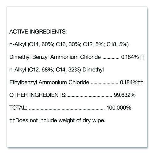 Product Details** Global Product Type Cleaner/Detergent Wet Wipes Towel/Wipe Type Cleaning/Disinfecting Wipes Material(s) Nonwoven Fiber Number of Plies 1 Number of Towels/Wipes Per Container 35 Scent Crisp Lemon Color(s) White Applicable Material Acrylic,Ceramic,Chrome,Fiberglass,Glass,Metal,Plastic,Tile,Vinyl,Wood Chemical Compound Hexoxyethanol,Alkyl C12-18 Dimethylbenzyl Ammonium Chloride,Alkyl C12-14 Dimethyl Ethylbenzyl Ammonium Chloride,C12-14 Alcohols Ethoxylated Proproxylate,Isopropanol,Citric Acid Dirt Types Bacteria,Dust,Fungus,Germs,Grease,Grime,Mildew,Mold,Soil,Viruses Length 8″ Width 7″ Product Packaging Canister Application Bathrooms,Day Care Centers,Gyms,Hospitals,Kitchens,Offices,Schools Product Biodegradability Indicator N Product Biodegradability in Days 0 Product Compostability Indicator N Compliance Standards EPA Reg. No. 5813-79,EPA List N Pre-Consumer Recycled Content Percent 0% Post-Consumer Recycled Content Percent 0% Total Recycled Content Percent 0% Disclaimer Statement Not for use on dishes, glassware or eating utensils. Not recommended for use on unpainted wood, unfinished, unsealed, unpainted, waxed, oiled or worn surfaces. Country Of Origin US Carton Weight 11 lbs. Carton Pack Quantity 12 EA Pack Quantity 0 UPC 044600015941 UNSPSC 47131803 Shipping Weight & Item Dimensions Weight 0.83 lbs. Length 8.44 in Height 3.31 in Width 3.31 in
