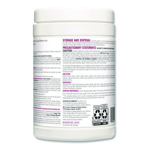 Product Details** Global Product Type Cleaner/Detergent Wet Wipes Towel/Wipe Type Cleaning/Disinfecting Wipes Material(s) Nonwoven Fiber Number of Plies 1 Number of Towels/Wipes Per Container 150 Scent Unscented Color(s) White Applicable Material Acrylic,Ceramic,Chrome,Fiberglass,Glass,Metal,Plastic,Tile,Vinyl,Wood Chemical Compound Bleach,Sodium Hypochlorite Dirt Types Bacteria,Dust,Germs,Soil,Viruses Length 8″ Width 6.75″ Product Packaging Canister Application Hospitals,Medical Facilities,Nursing Homes Product Biodegradability Indicator N Product Biodegradability in Days 0 Product Compostability Indicator N Compliance Standards EPA Reg. No. 56392-8,EPA List N Pre-Consumer Recycled Content Percent 0% Post-Consumer Recycled Content Percent 0% Total Recycled Content Percent 0% Disclaimer Statement For Healthcare Facilities Only Country Of Origin US Carton Weight 23 lbs. Carton Pack Quantity 8 EA Pack Quantity 0 UPC 729969691509 UNSPSC 47131803 Shipping Weight & Item Dimensions Weight 22.38 lbs. Length 21.06 in Height 8.88 in Width 10.81 in