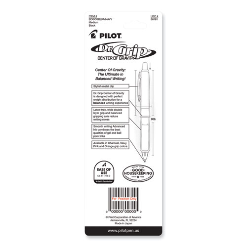 Product Details** Global Product Type Ballpoint Pens Pen Style Retractable Pen Tip Type Conical Pen Point Size Type Medium Color Family Black Erasable Ink No Refillable Yes Pen Sub-Brand & Product Family Dr. Grip® Center of Gravity Pen Type Ballpoint Pen Pen Point Size 1 mm Pen Ink Color(s) Black Pen Barrel Color(s) Silver/Navy Airplane-Safe Ink Yes Low-Viscosity Ink No Pen Grip Type Double-Layer Wide Ergonomic Visible Ink Supply No Pocket Clip Indicator Yes Manufacturer Pen Refill # 77271 Product Biodegradability in Days 0 Pre-Consumer Recycled Content Percent 0% Post-Consumer Recycled Content Percent 0% Total Recycled Content Percent 0% Country Of Origin JP Carton Weight 3 lbs. Carton Pack Quantity 36 EA Pack Quantity 0 UPC 072838361813 UNSPSC 44121704 Shipping Weight & Item Dimensions Weight 0.081 lbs. Length 7.25 in Height 0.63 in Width 2.63 in