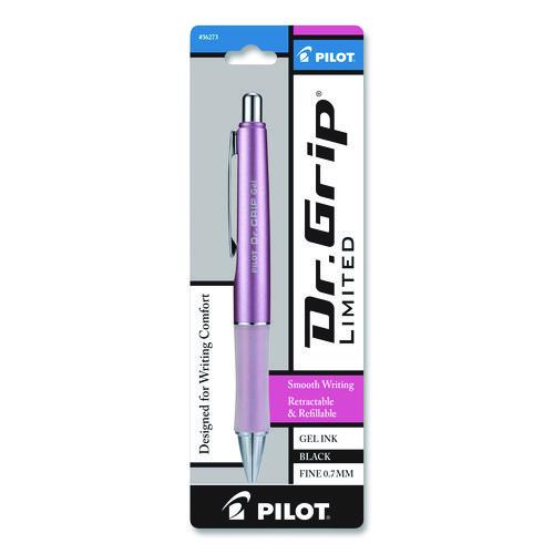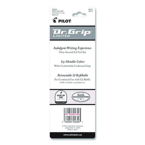Product Details** Global Product Type Gel Pens Pen Style Retractable Pen Tip Type Conical Pen Point Size Type Fine Color Family Black Erasable Ink No Refillable Yes Pen Sub-Brand & Product Family Dr. Grip® Limited Pen Type Gel Pen Pen Point Size 0.7 mm Pen Ink Color(s) Black Pen Barrel Color(s) Champagne Mauve Low-Viscosity Ink No Special Ink Properties Water-Based Gel Pen Grip Type Wide-Contour Cushion Visible Ink Supply No Pocket Clip Indicator Yes Manufacturer Pen Refill # 77240 Product Biodegradability Indicator N Product Biodegradability in Days 0 Product Compostability Indicator N Pre-Consumer Recycled Content Percent 0% Post-Consumer Recycled Content Percent 0% Total Recycled Content Percent 0% Country Of Origin JP Carton Weight 3 lbs. Carton Pack Quantity 36 EA Pack Quantity 0 UPC 072838362735 UNSPSC 44121701 Shipping Weight & Item Dimensions Weight 0.126 lbs. Length 7.176 in Height 0.496 in Width 2.46 in