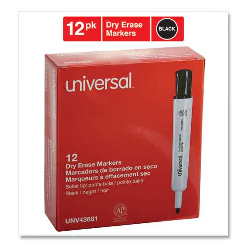 Product Details** Global Product Type Dry Erase Markers Marker Ink Type Dry Erase Marker Grade General Use Marker Tip Type Bullet Color Family Black Marker Tip Size (text) Medium Marker Color(s) Black Product Biodegradability Indicator N Product Biodegradability in Days 0 Product Compostability Indicator N Compliance Standards ACMI AP Non-Toxic Certified,Conforms to ASTM D4236 Standards Pre-Consumer Recycled Content Percent 0% Post-Consumer Recycled Content Percent 0% Total Recycled Content Percent 0% Country Of Origin CN Carton Weight 6 lbs. Carton Pack Quantity 12 DZ Pack Quantity 0 UPC 087547436813 UNSPSC 44121708 Shipping Weight & Item Dimensions Weight 0.46 lbs. Length 5.31 in Height 1.58 in Width 4.72 in Warranty Manufacturer’s limited one-year warranty.