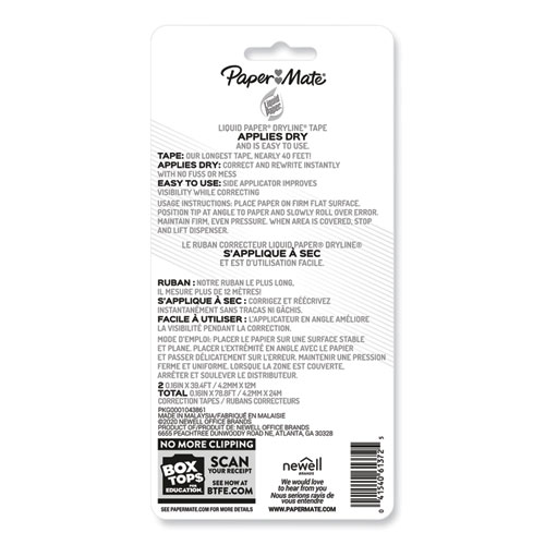 Easily correct handwritten or typed mistakes with Paper Mate Liquid Paper DryLine Correction Tape. Ideal for correcting single or multiple lines, this tape quickly fixes mistakes without making a mess. This correction tape resists breakage and tearing, allowing you to neatly correct long passages of text. It also applies dry, so you can copy, fax, edit, or type immediately after application.