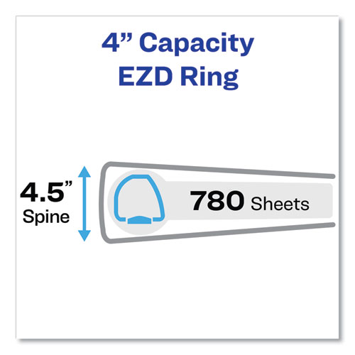 Product Details** Global Product Type Ring Binders Binder Style View Number of Rings 3 Binder Size Capacity 4″ Ring Style EZD Ring Color Family Black Binder Sheet Size 11 x 8.5 Binder Type Ring Binder Sheet Capacity 780 Binder Color(s) Black Ring Mounting Back Cover Material(s) Polypropylene Binder Pocket Description (1) Front Cover Pocket,(1) Back Cover Pocket Insert Description Front,Spine,Back Front Cover Insert Size 11.75 x 11.25 Spine Insert Size 3 x 11.25 Back Cover Insert Size 10.13 x 11.25 Product Biodegradability in Days 0 Green Information Contains a minimum of 34% post-consumer recycled content, 34% total recycled content. Pre-Consumer Recycled Content Percent 0% Post-Consumer Recycled Content Percent 35% Total Recycled Content Percent 35% Special Features Nonlocking Rings Country Of Origin MX Carton Weight 22 lbs. Carton Pack Quantity 6 EA Pack Quantity 0 UPC 077711098008 UNSPSC 44122003 Shipping Weight & Item Dimensions Weight 2 lbs. Length 12.4 in Height 3.7 in Width 11.8 in
