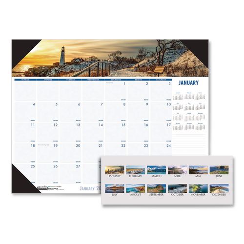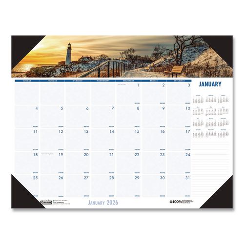 Product Details** Global Product Type Desk Pad Calendars Dated Yes Academic Year No Calendar Format Monthly Edition Year 2025 Calendar Term 12-Month (Jan to Dec) Binding Type Glued Color Family White Refillable No Calendar Spread Format One Month per Page Julian Dates Yes Size (Bound-Side First) 18.5 x 13 Binding Color(s) Black Corner Color(s) Black Page Theme Coastlines Photography Calendar Reference Blocks Current Year Sheet Color(s) White/Multicolor Holder Style Four-Corner Desk-Pad with Backboard (Included) Holder Color Black/Natural Holder Material Chipboard,Leatherette Reversible No Seasonal Availability Yes Product Biodegradability Indicator N Product Biodegradability in Days 0 Product Compostability Indicator N Green Information Printed with soy-based inks. Pre-Consumer Recycled Content Percent 0% Post-Consumer Recycled Content Percent 100% Total Recycled Content Percent 100% Disclaimer Statement This product was made using wood sourced from a certified managed forest. Country Of Origin US Carton Weight 29 lbs. Carton Pack Quantity 48 EA Pack Quantity 0 UPC 040983178860 UNSPSC 44121621 Shipping Weight & Item Dimensions Weight 0.623 lbs. Length 18.625 in Height 0.125 in Width 13 in
