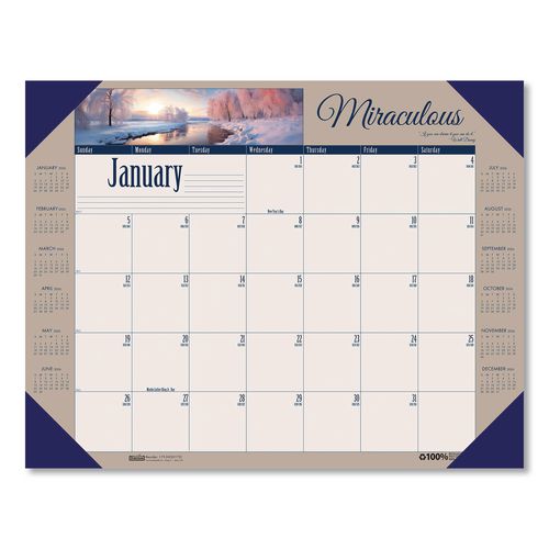 Each monthly calendar page contains an inspirational image, a motivational quote and a full, 12-month reference calendar for long-term planning. Strong blue leatherette reinforced corners keep pages in place and protected. Includes numbered weeks, Julian dates with days remaining and note space on each month. Made entirely of recycled materials.