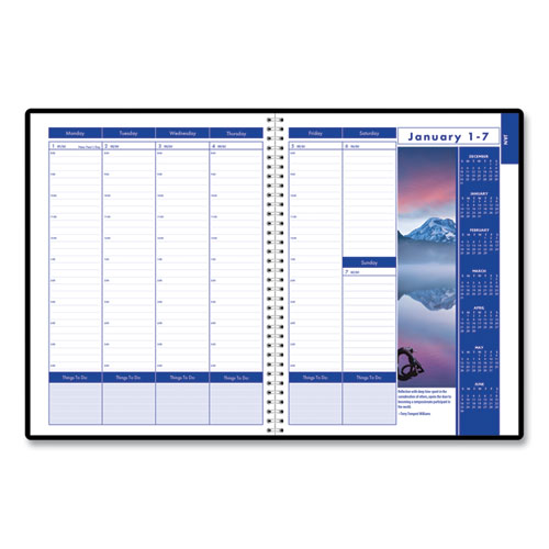 Enjoy nature scenes while scheduling your appointments and keeping yourself organized. Monthly and weekly spreads feature open note space and brightly colored die-cut tabs to help you quickly find the date you need. Reference calendar page detailing the current year and the next two full years, phone/address section for important contacts and an additional page with important holiday dates for three years. Includes a double-sided storage pocket. Black, embossed simulated-leather cover withstands daily use throughout the year. Made entirely of recycled materials.