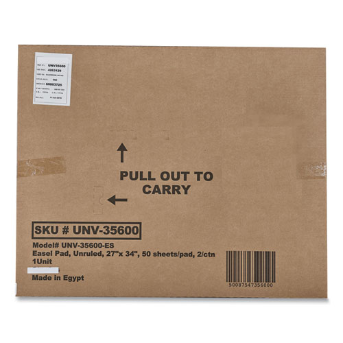 Product Details** Global Product Type Easel & Presentation Pads Pocket Sized No Pad-Binding Type Taped Pad-Binding Edge Top Number of Subjects/Sections 1 Color Family White Sheet Rule/Format Type Unruled Number of Section Dividers 0 Sheets per Pad 50 Sheet Size (Bound-Side First) 27 x 34 Sheet Color White Sheet Basis Weight (lb) 18 lb Bond Sheet Perforation Details Perforation Pad-Spine Width 27″ Pad Length 34″ Back-Cover Material Chipboard Hole-Punch Details Top: 3-Hole Product Biodegradability Indicator N Product Biodegradability in Days 0 Product Compostability Indicator N Pre-Consumer Recycled Content Percent 0% Post-Consumer Recycled Content Percent 0% Total Recycled Content Percent 0% Footnote 1 Top punched: 3-hole Country Of Origin IN Carton Weight 14 lbs. Carton Pack Quantity 2 EA Pack Quantity 0 UPC 087547356005 UNSPSC 44111903 Shipping Weight & Item Dimensions Weight 13.65 lbs. Length 34.842 in Height 0.866 in Width 27.559 in Warranty Manufacturer’s limited one-year warranty.