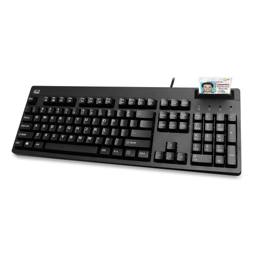 The AKB-630SB-TAA keyboard is an input device designed for GSA sales to goverment agencies, the military, their suppliers and vendors, and other organizations requiring end products manufacturered to U.S. Trade Agreement Act Specifications. The built-in smart card reader brings extra security and ease for banking transactions, identification systems, secure web applications, and secure logon. Due to its secure nature, smart card keyboards are extensivelty used by industries like banking, healthcare, e-commerce, and goverment agencies. This device supports multiple international standards including ISO7816 for IC card standard, PC/SC 2.0 for Windows Smart Card standard, Microsoft WHQL, EMV for Europay MasterCard Visa Standard and USB-IF CCID standard. Made with antimicrobial material which prevents the growth of harmful bacteria and protects against the build up of germs on the product.