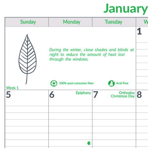 Designed with the future in mind with an ecological tip each month. Ruled daily blocks and full-year reference calendar for future planning. Reinforced chipboard backer.