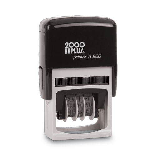 Combine date and phrase for efficient stamping. Common business phrases included. Use either year or phrase. Four-band date: months, days and five-year band. Innovative Band Shield Technology: Say goodbye to messy hands! Our Band Shield Technology prevents ink from coming into contact with your hands and fingers during the date-changing process. Self-inking dater with plastic frame. Type size 1.5.