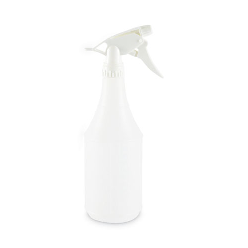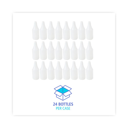 Clear bottle with embossed scale encourages user to properly proportion chemicals from larger containers and when mixed with water. Sleek, tapered neck bottle provides a more comfortable grip when used with a trigger sprayer. Easy-to-use, multi-purpose bottle for general-purpose cleaning in kitchens, bathrooms, offices, schools, and industrial settings. It securely holds cleaning solvents and water without spilling. Trigger sprayers sold separately.