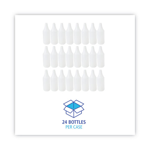 Clear bottle with embossed scale encourages user to properly proportion chemicals from larger containers and when mixed with water. Sleek, tapered neck bottle provides a more comfortable grip when used with a trigger sprayer. Easy-to-use, multi-purpose bottle for general-purpose cleaning in kitchens, bathrooms, offices, schools, and industrial settings. It securely holds cleaning solvents and water without spilling. Trigger sprayers sold separately.