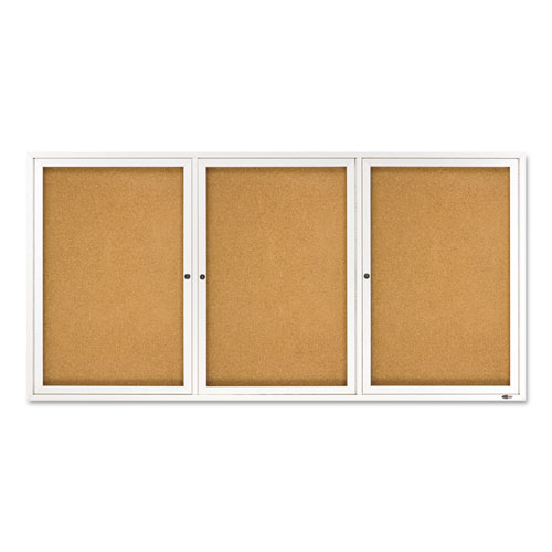Enclosed Indoor Cork Bulletin Board with Three Hinged Doors, 72" x 36", Tan Surface, Satin Aluminum FrameEnclosed Indoor Cork Bulletin Board with Three Hinged Doors, 72″ x 36″, Tan Surface, Satin Aluminum Frame